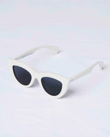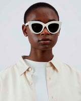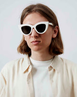 Designed by Marco Galleani and handmade in Sabae, Japan the limited edition OH-14 is an oversized cat-eye model, inspired by classic icons in the 1950s. This chunky frame comes in a white Italian acetate combined with dark grey lenses, evoking a retro-feeling yet in a contemporary, modern look. One pair takes up to six months to complete.